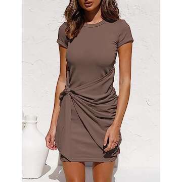 BTFBM Women 2025 Spring Casual Short Sleeve Ruched Bodycon Tank T Shirt Dress Tie Waist Sun Beach Summer Mini Dresses(Short Sleeve Coffee, Medium)