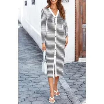 This stunning dress features a V-neck design and long sleeves, making it suitable for both cozy days and glamorous nights. The playful striped pattern, complemented by decorative buttons, adds a touch of sophistication to the overall look. With a flattering midi length, this dress can be paired effortlessly with heels for a night out or with sneakers for a casual day.