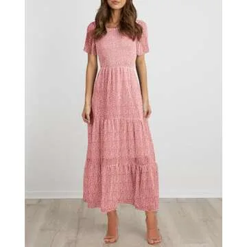 BTFBM Women Casual Short Sleeve Crew Neck Summer Dress Bohemian Floral Printed Flowy Maxi Dresses Tiered Cocktail Dress(Pink, X-Large