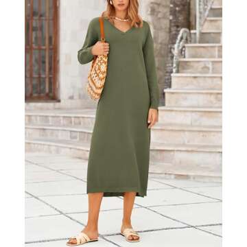 Show more This stunning Women's Long Sweater Dress is designed for the modern woman who values both style and comfort. Crafted from a soft and cozy fabric, it offers warmth during the colder months while ensuring a fashionable appearance. With its lovely v-neck design and long sleeves, this dress adds a touch of femininity to your wardrobe. The dress features a maxi length and comes with subtle side slits that provide a hint of allure, making it suitable for various occasions from casual outings to more dressed-up events.