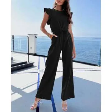 Show more Introducing the BTFBM Women Jumpsuits Crew Neck Ruffle Cap Sleeve Belted High Waist Wide Leg Romper, the ultimate summer outfit designed for elegance and comfort. Crafted from premium, soft stretchy fabric, this jumpsuit ensures a breathable experience, making it ideal for those warm spring and summer days. Its moderate thickness prevents any see-through issues, while the chic crew neck and stylish ruffle cap sleeves elevate your look effortlessly. With a high waist silhouette and a self-tie belt, the romper accentuates your waist and beautifully elongates your legs, offering a flattering fit for various body types.