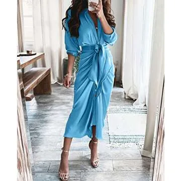 Show moreIntroducing the BTFBM Women Long Sleeve Satin Dress: A stunning blend of elegance and practicality, this maxi shirt dress is an essential addition to your wardrobe for the summer and fall seasons. Crafted from a soft and breathable satin material, this dress feels luxurious against the skin, offering a lightweight experience that’s perfect for various occasions. The elegant lapel V-neck and button-down design allow for versatility; with a continuous button placket, you can easily adjust the neckline to suit the setting, whether you're at a casual brunch or a chic dinner party. The tie waist beautifully cinches in your silhouette, enhancing your figure while the flattering ruffle hem elevates your overall look. Available in sizes S (US 4-6) to XL (US 16-18), this dress fits beautifully on various body types, making it a go-to choice for comfort and style.