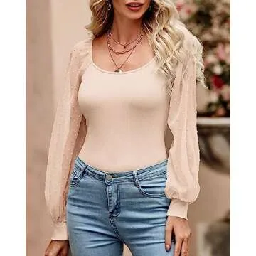 BTFBM Women Mesh Puff Long Sleeve Shirts Tops Scoop Neck Swiss Dots Sheer Slim Fit Casual Ribbed Knit Shirt Blouses Top(Solid Apricot, Large)