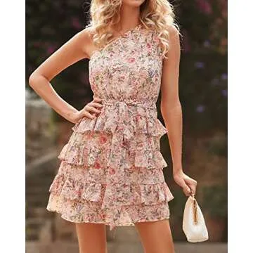 BTFBM Women One Shoulder Summer Dresses 2025 Floral Sundress High Waist Tiered A Line Mini Beach Wedding Guest Dress(Floral Pink, Medium)