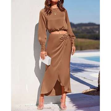 Show more Introducing the BTFBM Women’s 2023 Fall Two Piece Outfit, a captivating ensemble designed to elevate your wardrobe! This stylish set features a luxurious satin fabric that drapes beautifully, making it the perfect choice for any special occasion or casual outing. The combination of a chic crew neck long sleeve crop top and a flowy maxi skirt creates a silhouette that flatters all body types, ensuring you look effortlessly elegant. The outfit's smooth and soft texture ensures maximum comfort, while the elastic waistband allows for a flexible fit that accommodates most figures.