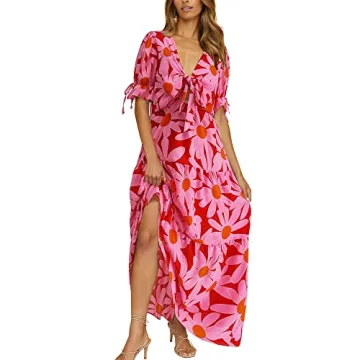 BTFBM Women's 2024 Summer Boho Dress Tie Front Deep V Neck Cutout Short Sleeve Floral Casual Party Beach Maxi Dresses