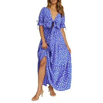 Show more Introducing the stunning BTFBM Women's Casual Beach Dress, a quintessential addition to your summer wardrobe that blends elegance and comfort seamlessly. This exquisite dress is designed for women who appreciate style without compromising on comfort. The short sleeves with ruffle cuffs add a touch of whimsy, while the deep V-neck and tie front enhance your feminine charm, making it the perfect choice for various occasions. Available in a range of beautiful colors, including Floral Blue White and much more, this dress utilizes a delicate floral print that radiates vitality while ensuring opacity and modesty, thanks to its thoughtfully chosen materials.
