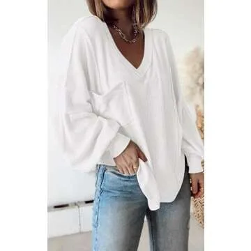 BTFBM Women's Casual V Neck Ribbed Knit Shirts 2025 Fall Pullover Tunic Tops Loose Balloon Long Sleeve Blouses Top(Solid White, Large)