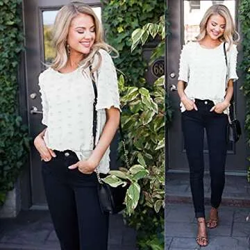 Show more Step into summer style with the BTFBM Women's Cute Swiss Dot Casual Summer Tops, a must-have addition to your wardrobe! Crafted from soft, lightweight fabric, this chic top is designed to keep you cool and comfortable during those hot days. The elegant crewneck design and delicate short sleeves create a flattering silhouette that complements various body types. With its playful Swiss dot pattern, this blouse adds a dash of femininity to any outfit without compromising on comfort. Ideal for casual outings or semi-formal events, this versatile piece offers both style and practicality, making it perfect for your busy lifestyle.