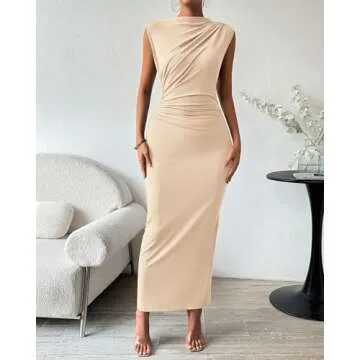 BTFBM Women's Ruched Bodycon Dress Summer Casual Sleeveless Back Slit Elegant Club Evening Party Cocktail Maxi Dresses(Solid Beige, Large)