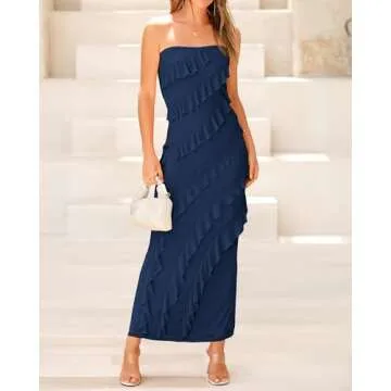 Show more Introducing the BTFBM Women's Summer Long Formal Wedding Guest Dress, a chic and stylish Cocktail Dress designed for women who want to turn heads at any event. This strapless tube ruffle maxi bodycon dress features a fabulous solid navy hue that exudes elegance and sophistication. Made from comfortable and lightweight mesh fabric, it ensures a smooth wearing experience while allowing for great stretch to flatter a variety of body shapes.