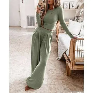 Show moreStep into effortless style and comfort with the BTFBM Women's Two Piece Lounge Set. This chic ensemble combines a long-sleeve ribbed knit crop top with loose wide-leg pants, perfect for a leisurely day at home or a casual outing. Crafted from high-quality, super soft fabric, this loungewear outfit ensures you feel great while looking fabulous. The simple yet fashionable design is available in a striking solid bean green, making it a versatile addition to any wardrobe. With sizing options ranging from S to XXL, this set is designed to flatter every figure and size, ensuring you find your perfect fit.
