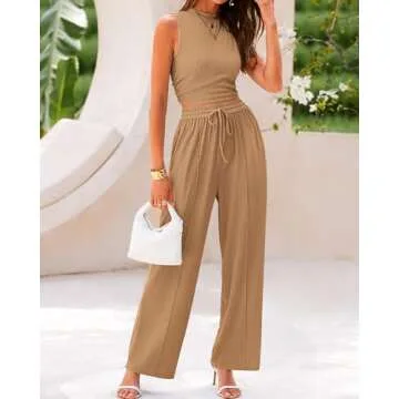 BTFBM Women Summer 2 Piece Outfits Ribbed Knit Crew Neck Sleeveless Cropped Top Elastic Waist Wide Leg Pants Lounge Set(Solid Camel, Small)