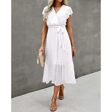 BTFBM Women Summer Bohemian Floral Casual Wrap V Neck Ruffle Cap Sleeveless Belt A-Line Pleated Hem Swing Midi Sun Dress (Swiss Dot White, m)