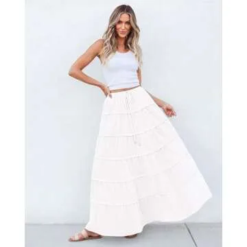BTFBM Women Summer Tiered Maxi Skirt Drawstring Elastic Mid-Waist A Line Boho Beach Dress Flowy Long Skirts with Pocket(Solid White, Medium)