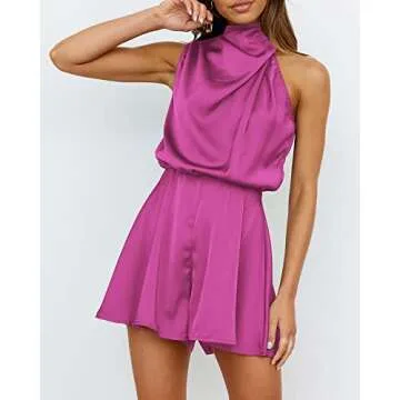 BTFBM Womens Mock Neck Summer Romper 2025 Casual Beach Outfits Satin Sleeveless Elastic Waist One Piece Shorts Jumpsuits(Solid Rose Red, Medium)