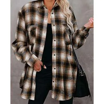 BTFBM Womens Plaid Jacket Long Sleeve Button Down Casual Flannel Shacket Shirts Loose Fall Spring Blouses Tops 2025(Plaid Brown, Medium)