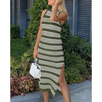 Show moreIntroducing the **BTFBM Women's Sleeveless Summer Dress 2025**, a timeless piece that combines comfort and style seamlessly. This long tank dress is designed for the modern woman who values versatility and a fashionable flair. Featuring a **crew neck** and **sleeveless** design, this dress is perfect for warm summer days, while its **striped print** and **tiny hollow-out details** add a sophisticated yet casual touch. The **side slit** accentuates your legs, allowing for freedom of movement, making it not just a dress but an experience to wear.