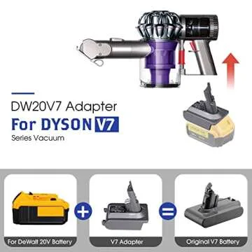 Show more Introducing the perfect solution to enhance the performance of your Dyson V7 vacuum! This innovative DW20V7 Adapter is specifically designed to make your Dyson V7 tool compatible with DEWALT 20V MAX XR batteries. No more worrying about short battery life as this adapter allows you to enjoy the benefits of lithium-ion batteries, giving you extended operating time and improved suction power. Say goodbye to the frustration of your vacuum dying mid-clean!