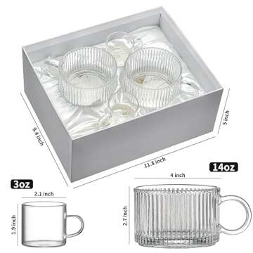 Buaic Glass Coffee Mugs, Vintage Vertical Stripes Coffee Mugs 14 Oz Set of 2, Glass Coffee Cups for Cappuccino, Latte,Cereal,With 2 PACK Espresso Cups, Wish Card Gift Box for Coffee Lover