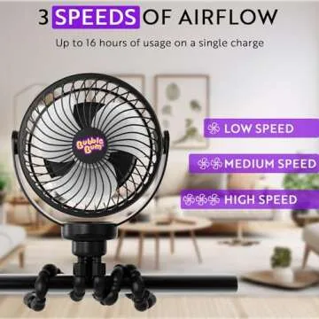 bubblebum Portable Fan, Rechargeable Travel Fan, Clip on Baby Stroller Fan for Bed, Car, Treadmill and Bike, Mini Portable Fan with 3 Speed and LED Light Settings plus 360° Rotation – Black
