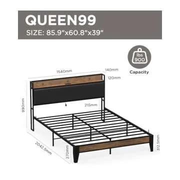 BUCOTOD Bed Frame with Storage Headboard, Built-in Charging Station, Easy Assembly, Noise Free, Non-Slip Design, Sturdy and Stable, No Box Spring Needed, Heavy Duty Metal Support Bed Frame-QUEEN99