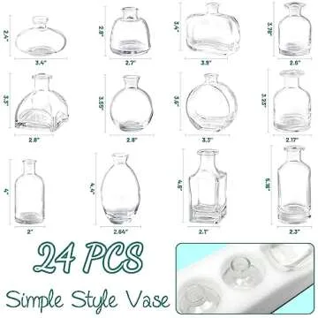 Show more Introducing our stunning set of 24 Elegant Glass Bud Vases, which includes 12 different shapes, each provided with two identical pieces. This versatility allows you to mix and match according to your interior style, creating a beautiful display that reflects your mood and enhances your home decor effortlessly.