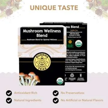Show more Experience the transformative power of wellness with the Mushroom Wellness Blend Tea by Buddha Teas. This unique tea is more than just a beverage; it's a journey into health and vitality, providing a rich blend of four potent tonic mushrooms: chaga, reishi, lion’s mane, and cordyceps. Together, they create a balanced and nutrient-dense drink that nourishes both body and soul at any time of the day.