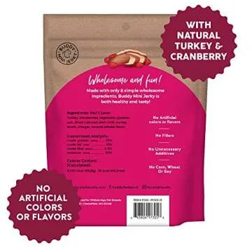 Show moreIntroducing the premium BUDDY BISCUITS Mini Jerky, a delightful dog treat thoughtfully crafted for your furry friend. Made in the USA, these delectable 4oz treats shine with simplicity and quality—featuring only 8 natural ingredients. The first ingredient, real turkey, paired with wholesome cranberries, ensures that your dog is snacking on food that supports their health and vitality. Unlike many dog treats on the market, we steer clear of artificial colors, flavors, and fillers, providing a safe, nutritious option that you can trust for your pet.