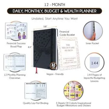 Show more Introducing the ultimate UNDATED BUDGET PLANNER - a deluxe financial guide designed to transform your relationship with money and empower you to achieve financial success! Measuring at A5 Size (5.8 x 8.3 inches), this planner is crafted with thick 100 gsm paper and features an inner pocket for added convenience. With a comprehensive financial success roadmap, it includes 12 monthly planning overviews, enriched with impactful budgeting lessons over 144 pages. This planner even includes three sheets of colorful budget affirmations and stickers, igniting your journey to financial freedom!