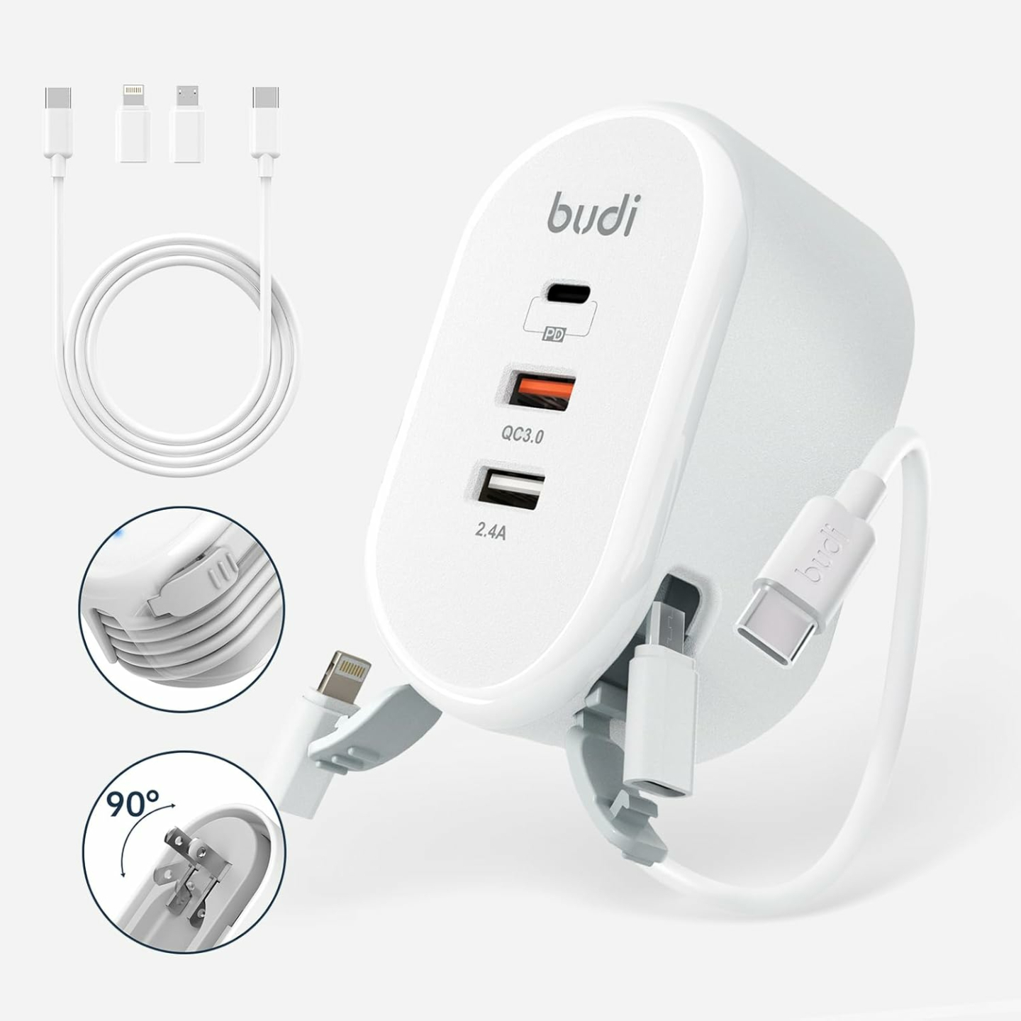 Budi 38W 3-Port USB Wall Charger with Built-in Cables