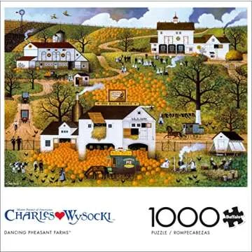 Show more Discover the captivating world of jigsaw puzzles with the Buffalo Games - Charles Wysocki - Dancing Pheasant Farms - 1000 Piece Jigsaw Puzzle. This beautifully illustrated puzzle features a serene and colorful landscape that invites you to unwind and get lost in the art of assembling. Crafted from premium quality materials, it showcases the vibrant artistry of renowned painter Charles Wysocki, known for his nostalgic depictions of American life. With a finished size of 26.75 x 19.75 inches, the puzzle promises not only a challenging experience but also a stunning display piece once completed. Moreover, it includes a full-color bonus poster to assist you in solving the puzzle, ensuring that even the most intricate details are manageable.