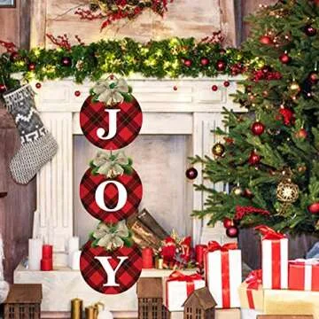 Show moreTransform your holiday decor with our exquisite Buffalo Plaid Christmas Wreaths for Front Door. These charming 3-piece rustic decorations spell out "J", "O", and "Y", perfectly embodying the festive spirit you want to share. Measuring 12" x 13.74" each, these signs are designed to be eye-catching, making a delightful statement on your front door, garage, or any entryway. Crafted from durable plastic cardboard, they are lightweight yet robust, ensuring they last through the season without fading or weathering. Hang them with ease and bring a joyful ambiance to your home that family and friends will admire.