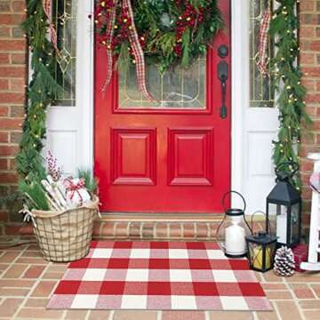 Show moreIntroducing the Buffalo Plaid Outdoor Rug, a stunning addition to your home decor. Sized at 24'' x 35'', this versatile rug combines functionality with style, making it the ideal choice for both indoor and outdoor spaces. Crafted from environmentally-friendly cotton, it features a charming white and red buffalo check pattern, bringing a festive touch to your farmhouse or contemporary décor. This handmade woven plaid rug is designed to withstand the elements, ensuring long-lasting beauty and durability. Whether it’s enhancing a porch entrance or providing warmth in the living room, this rug is perfect for creating that cozy, inviting atmosphere during the holiday season.