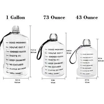 Show more This incredible one-gallon water bottle is not just a container; it's a lifestyle change! Made with durable, high-quality materials, this bottle ensures you stay hydrated throughout your busy day. The thoughtful design includes motivational quotes that inspire and encourage you to keep sipping, making hydration a fun and enjoyable habit. The built-in sturdy handle makes it easy to carry, even when it’s full! Whether you're at the gym, the office, or simply enjoying a day outdoors, this water bottle is the perfect companion for anyone looking to increase their water intake.