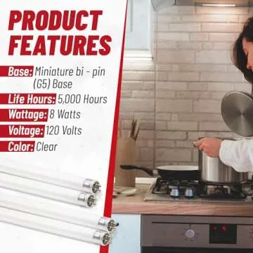 Show moreIlluminate your space with the BULBMASTER F8T5 CW Fluorescent Bulbs, designed to offer exceptional lighting where you need it most. This Pack of 6 features 12-inch T5 bulbs with a cool white color temperature of 4100K, making them ideal for under cabinet lighting and closet fixtures. Each bulb delivers a powerful 380 lumens of brightness while consuming just 8 watts of energy, ensuring efficiency without compromising on light quality. The lifetime of these bulbs is remarkable, lasting up to 5,000 hours, which means less frequent replacements and more time enjoying a well-lit space.