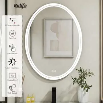 Show more Introducing the BuLife 28 x 20 inch Oval LED Bathroom Mirror, the ultimate addition to your bathroom that combines modern technology, elegant design, and unparalleled functionality. This wall-mounted lighted vanity mirror is not just a mirror; it's a sophisticated lifestyle upgrade. With a variety of features including a Brightness & Color Temperature Adjustment that allows you to easily shift between three color temperatures (3000K, 4500K, and 6000K), you can create the perfect ambiance for any time of day. Whether you need cool light for precision shaving or warm light for a relaxing evening routine, this mirror adapts to your needs with a simple touch of a button.