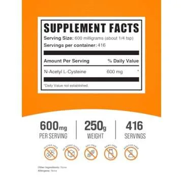 BulkSupplements.com NAC Powder - N-Acetyl Cysteine 600mg, NAC Supplement - Antioxidant Support, Gluten Free - 600mg per Serving, 416 Servings, 250g (8.8 oz) (Pack of 1)