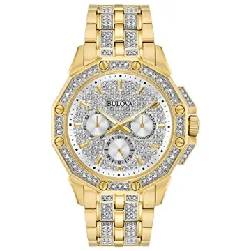 Show moreIntroducing the stunning Bulova Men's Crystals Octava Gold Tone Stainless Steel 6-Hand Multi-Function Quartz Watch (Style: 98C126), where elegance meets functionality. This exquisite timepiece not only defines sophistication but also embraces practicality for the modern gentleman who values style and utility. The watch is meticulously crafted from resilient gold-tone stainless steel, fully embellished with a remarkable 306 crystal accents that sparkle brilliantly under any lighting condition, making it an ideal statement piece for various occasions.
