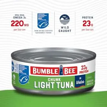 Show more Introducing the Bumble Bee Chunk Light Tuna in Water, a delightful culinary staple that ensures you never compromise on taste or health. Each pack contains 24 five-ounce cans of premium wild-caught skipjack tuna, celebrated for its light, flaky texture and robust flavor profile. This versatile fish is perfect for whipping up classic tuna melts, enriching casseroles, or adding a protein boost to your salads and sandwiches. Enjoy the convenience of a pantry staple that’s ready to transform your meals in seconds!