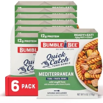 Show more Introducing the Bumble Bee Quick Catch Mediterranean Pasta, a scrumptious solution for those seeking convenience without sacrificing flavor! This pack includes six individual 6-ounce bowls, each brimming with a delightful mix of wild-caught tuna, Mediterranean spices, vibrant tomatoes, green beans, and pasta. With a generous 12 grams of protein packed into each bowl, you can enjoy a meal that is as nutritious as it is tasty. Perfectly suited for those busy days, these ready-to-eat meals are ideal for quick lunches, satisfying dinners, or snacks on-the-go.