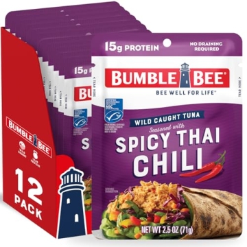 Show moreIntroducing the Bumble Bee Spicy Thai Chili Seasoned Tuna – a delectable fusion of flavor and health packed in convenient 2.5 oz pouches. This gourmet tuna is made from high-quality skipjack, marinated with a tantalizing blend of chili, garlic, and onion. Perfectly balanced, every pouch contains a remarkable 15g of protein and only 90 calories, making it an unbeatable choice for health-conscious snackers and those on the go. Whether you're gearing up for a busy workday or planning a weekend adventure, this tuna brings the perfect solution to your protein needs.