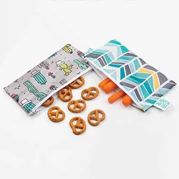 Bumkins Reusable Snack Bags, for Kids School Lunch and for Adults Portion, Washable Fabric, Waterproof Cloth Zip Bag, Supplies Travel Pouch, Food-Safe Storage, 2-pk Cactus and Quill