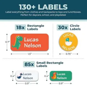 Bunny Badges Personalized Daycare Name Labels (130 Labels) - Custom Waterproof Name Stickers for Clothing Tags, Water Bottles, Lunch Boxes and School Supplies (Dinosaurs)