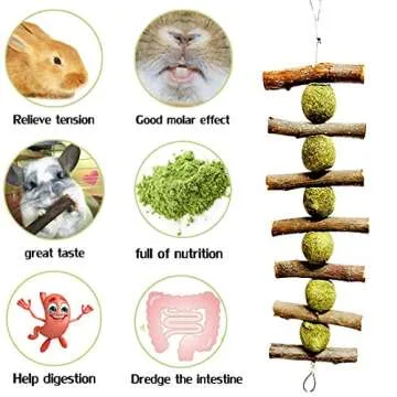 Show moreDiscover the ultimate treat for your fluffy friend with our Bunny Chew Toys for Teeth. Designed specifically for rabbits, chinchillas, guinea pigs, and hamsters, these natural organic apple sticks provide a fun and engaging way to satisfy your pet’s chewing instincts while promoting their dental health. Made from high-quality materials, these chew toys are not only durable but also safe for your beloved pets to gnaw on. Each package includes a delightful combination of Timothy hay balls and sturdy wooden sticks that can be hung in different orientations, allowing your pets to interact with them in a variety of ways.