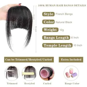 BUPPLER Clip in Bangs 100% Real Human Hair Pieces French Natural Black Fake Bangs Hair Clip on bangs for women Faux Bangs Clip in Hair Extensions with Hair Roller for Daily Wear