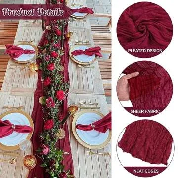When you compare our Burgundy Cheesecloth runner to other table decorations on the market, its unique combination of durability, elegance, and affordability sets it apart. Many competitors offer basic tablecloths that lack character and cannot be reused with ease. Our cheesecloth runner’s combination of a soft touch, romantic crinkle, and machine-washable fabric makes it a favorite choice among buyers who want style without sacrificing functionality. Choose our cheesecloth runner to elevate your event decor to the next level!