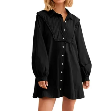 Burtell Women Flowy Long Puff Sleeve Mini Dress Casual Lapel Collar Button Down Babydoll Dress Solid A-line Tunic Shirt Dress Black