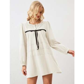 Show more Introducing the Burtell Women Flowy Long Puff Sleeve Mini Dress, a masterpiece in casual elegance designed for the modern woman. This delightful mini dress captures attention with its charming square neck and stunning lace trim, embodying both comfort and style. Crafted from a lightweight cotton blend, it gently hugs the body while allowing for breathability, making it an ideal choice for leisure or vacation wear. The intricate lace design featured at the neckline, cuffs, and center creates an ethereal aura, perfect for those who desire a touch of whimsy in their wardrobe. With long puff sleeves and a playful bow tie front, this dress adds a cute, youthful twist to any outfit, ensuring you stand out on any occasion.