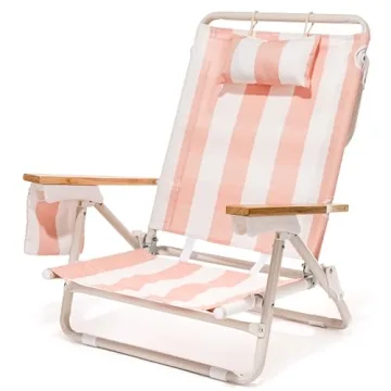 Show moreIntroducing the Business & Pleasure Co. Holiday Tommy Chair, your ideal companion for beach days filled with style and relaxation. This chic and functional reclining backpack beach chair features an eye-catching pink capri stripe design, seamlessly blending fashion with practicality. Engineered with a high-quality powder-coated aluminium frame and elegant wooden armrests, the Holiday Tommy Chair does not compromise on durability while ensuring maximum comfort for all your sunbathing needs.